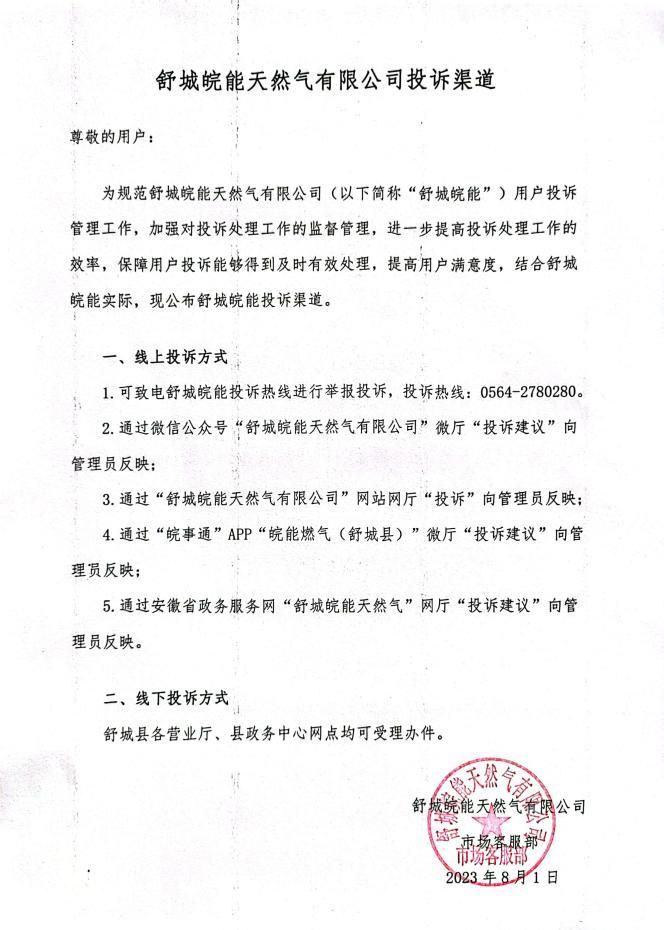 舒城皖能天然气有限公司投诉渠道-九游会平台